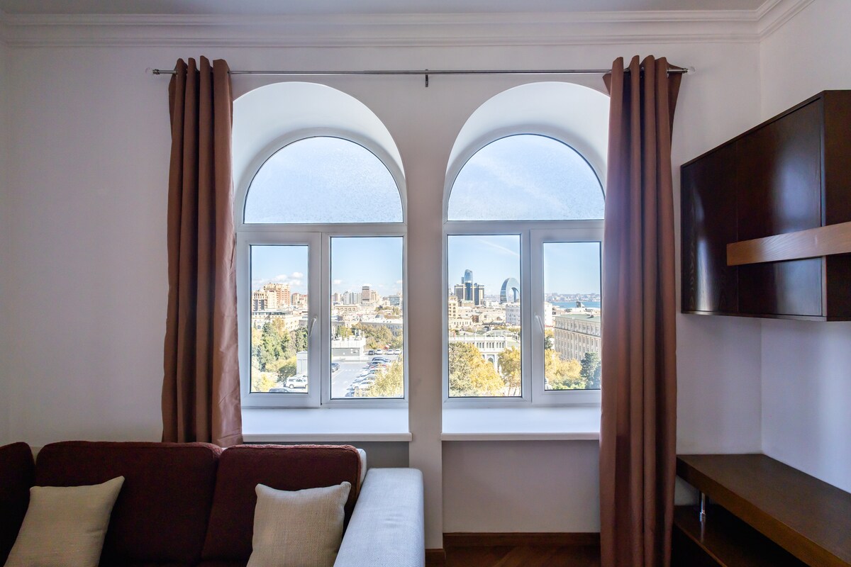 Newly renovated beautiful studio apartment is situated in the heart of city and it has a short WALKING distance to the main sights like Targovy or Nizami Street (2 min), Seaside Boulevard (2 min), Old City and etc. as well as very easy access to public transportation (2 min walk to Sahil Metro s/t).The apt. is ideal for couples & has all premises to make your stay safe & comfortable with an equipped kitchen, washing machine, bath essentials, AC, hygienic bed linen&towels, full-size bed, elevator