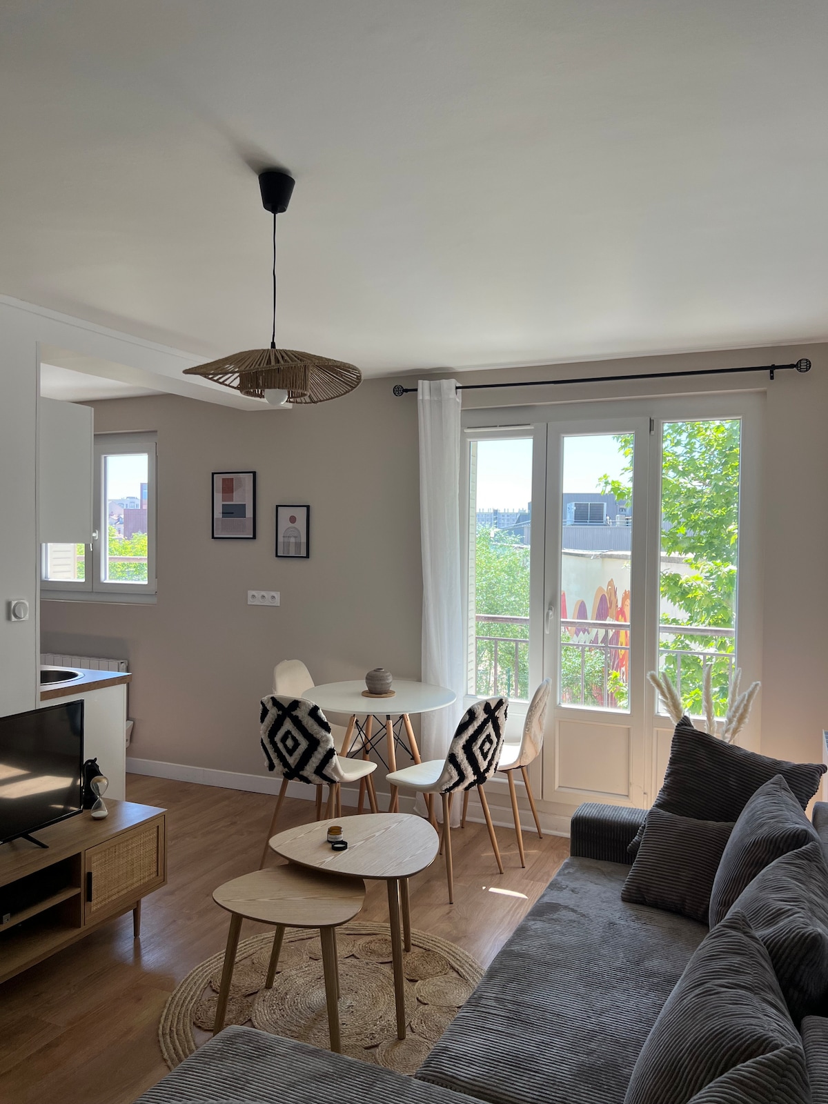 Welcome to your peaceful haven, a cozy and warm studio not overlooked, designed with Balinese inspirations. The studio is located on the 2nd floor (no elevator) and includes: - A sleeping area with a comfortable bed. - A cozy sitting area with TV. - A fully-equipped designer kitchen. - A modern bathroom. - A small balcony not directly overlooked. Located close to all amenities and public transport (Metro D and bus C16).