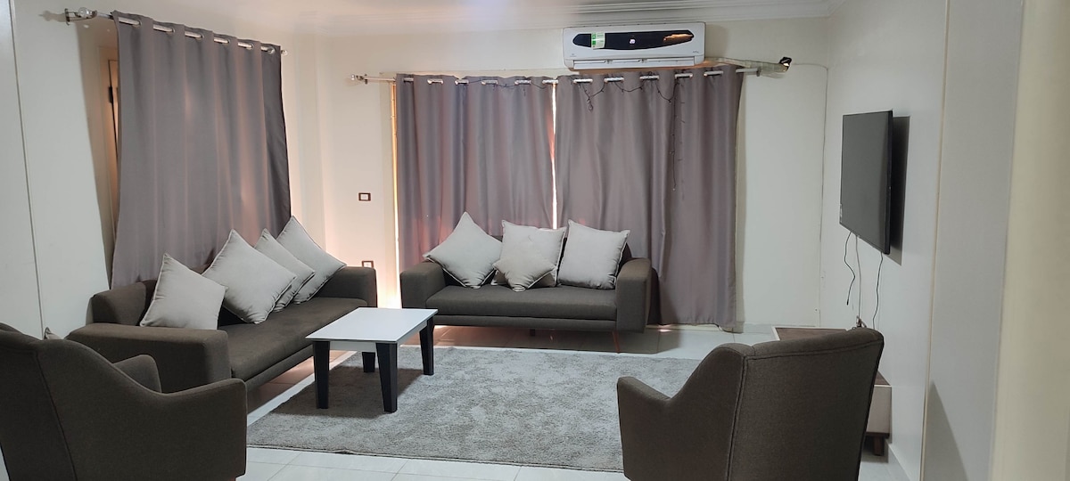 Enjoy a stylish experience at this centrally-located place. It’s designed to feel like home . Forget your worries in this spacious , modern space. It’s 5 minutes near the 6th Of October center. 20 minutes from mall of Egypt . 7 minutes from mall of Arabia . 5 minutes to husaray mosque. All the amenities are within walking distance. It’s located in a very lively compound. It’s equipped with everything you can need . : )