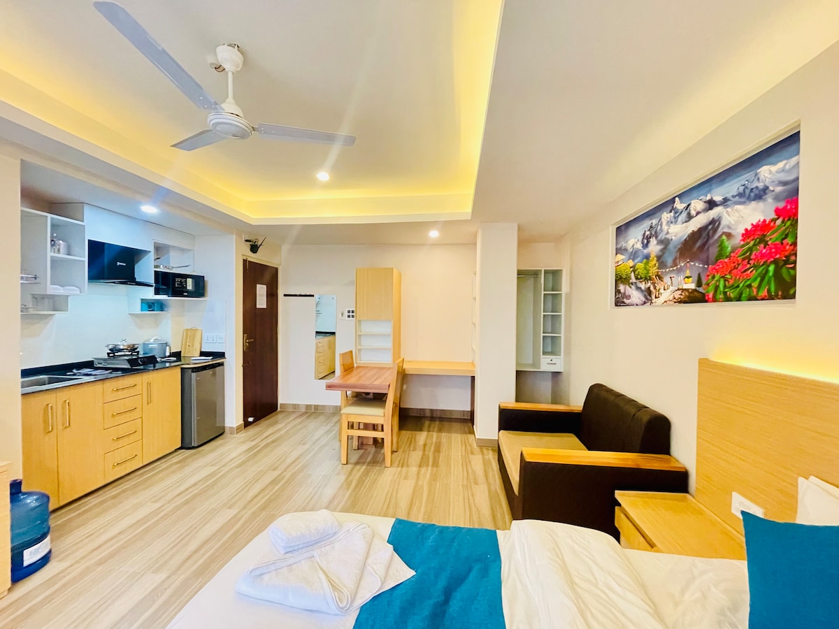 Our cozy studio apartment in the heart of Pokhara offers comfort and convenience. The space includes an equipped kitchen with attached bathroom , a queen-sized bed and comfy mattress, a smart TV, and free Wi-Fi. Enjoy stunning 360-degree views of the Pokhara Valley and Himalayas from the rooftop, perfect for sunset BBQs. A taxi stand and public bus stop are just a minute walk away, providing easy access to tourist destinations. Perfect for a long or short relaxing, convenient stay in Pokhara.