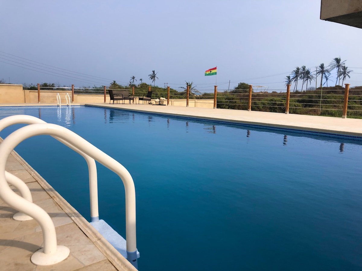 Escape to our luxurious 2-bedroom apartment, perfect for families & groups Enjoy: -Blazing Fast WiFi for work & streaming like Netflix -Big & cosy king-sized beds for a perfect sleep -Gated compound with electric fence, parking space for up to 7 cars, automated gate. -🌼Garden with soothing fountain and kids play area -Outdoor sitting area for relaxation/smoking -Connects you easily to Cape Coast & Elmina Castles 🏰Kakum Park, restaurants. Book now & experience the best of Ghana hospitality