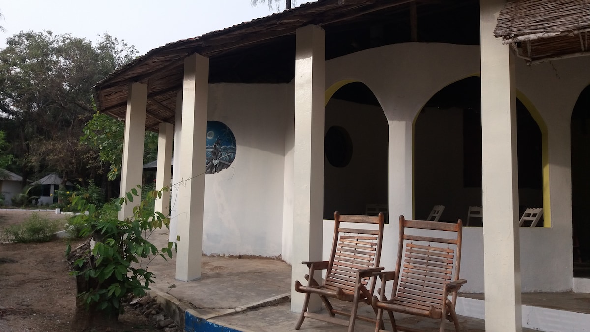 Enjoy the tranquility of the forest, just a 10-minute walk from Abene's main street and 20 minutes from the ocean. The newly renovated bungalow is solar-powered with two wells, offering a simple, traditional design and basic amenities typical of rural Senegal. It's not a luxury hotel, but secure with locking doors. You may encounter small geckos and hear local sounds—drums, distant cooking, or radios—adding to the authentic rural experience.