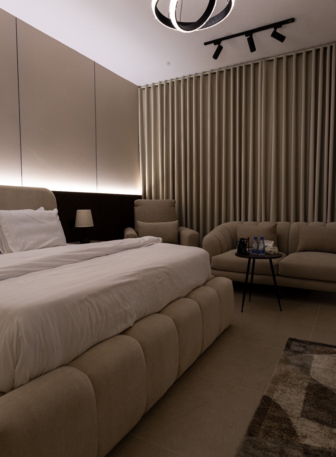 سعينا لكي نصنع لكم مكان للراحه يتناغم مع مزاجكم الرايق والجميل بشقة ذو تصميم راقي واثاث انيق تتكون من غرفه معيشه وغرفة نوم ذو سرير كينج ودورة مياه ومطبخ مفتوح على الصاله وبه طاوله بار للاستفادة من الطاوله كطاوله طعام ،،