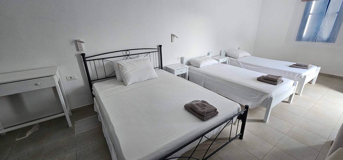 Type:2 Adjoining Rooms Size:41m2 Occupancy:4 Distabce of the Beach:40m Bedrooms:2(1Double Bed&2single beds) Bathroom:1(Hot Water-Shower&Bath amenities) Kitchenette:Yes Taverns-Shops:35m Pharmacy:20m PublicParking:25m Bus Stop:15m Bakery:90m Market:20m Paid Services:Car-moto rental,Pick up,Guide tours by bus&sea excursions to Volcano-Anafi&Oia Amenities:Bed Linen&Towels/Closet/Hairdryer/Safebox/TV/2 A/C/Fridge,Hotplate,Silverware,Cookware,Tea&Water Electric Kettle /Filter&Coffee machine/Free WiFi