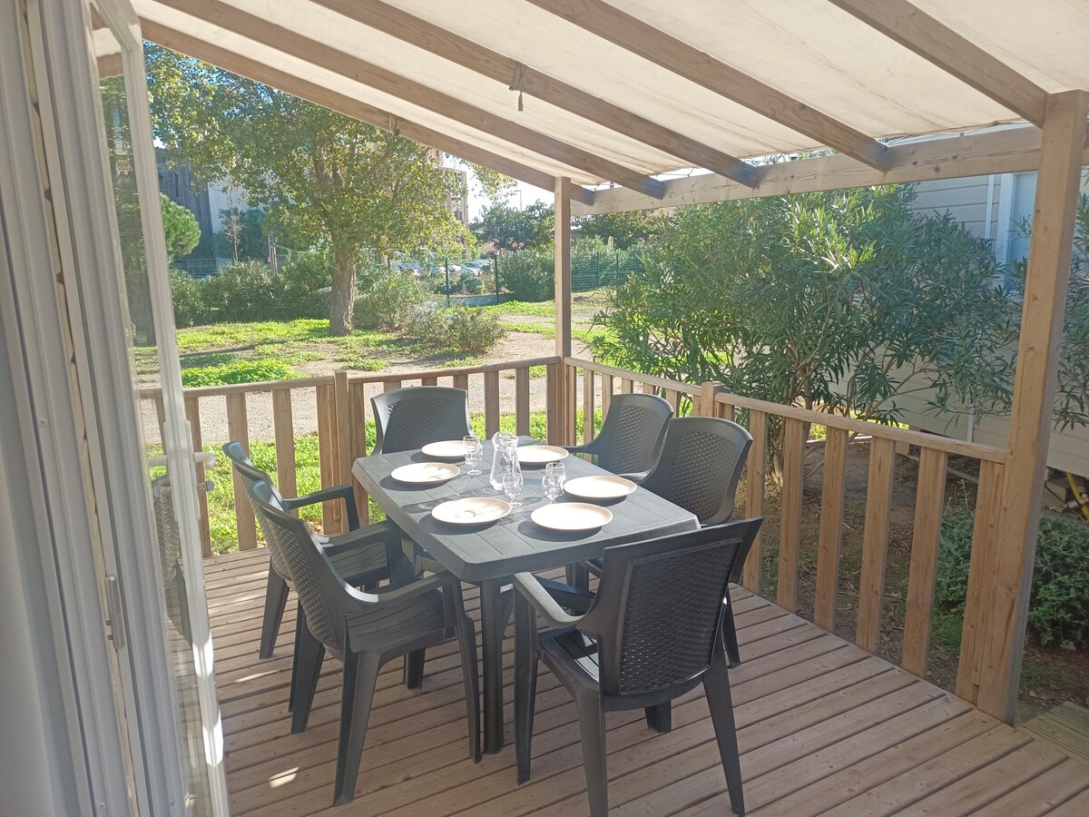 **Wake up to birdsong!** Premium mobile home, ideally located in a peaceful site. 5km from Aresquiers beaches, 1km from ornithological lagoons and scrubland massif. Shops nearby. Fully equipped accommodation (6 people) with flexible layout. - Air conditioning • Fully equipped kitchen • Living room - corner bench seating • Shower room, separate WC • Covered terrace with table and chairs • Private parking • Aquatic complex: 2 pools+slide+paddling pool • Dedicated concierge service (enhanced stay)
