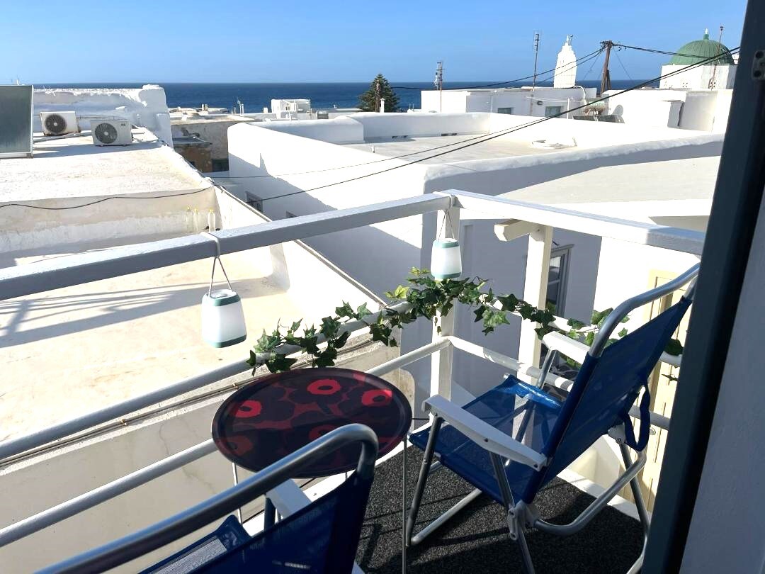 You can enjoy a side sea view and as you can see in the photos it is 15 steps from the sea. 10 meters away there is Sun Kyma café- bar-restaurant, where you can enjoy your meal you want during the day cocktails or breakfast . Next to the rooms you will find FLISVOS watersports club as well as a lovely sandy beach with sunbeds. You will find my place 10-15 minutes walking from the center of Naxos town (Chora) , 10 minutes by car from the port of Chora and 30-40 minutes walking with luggage.