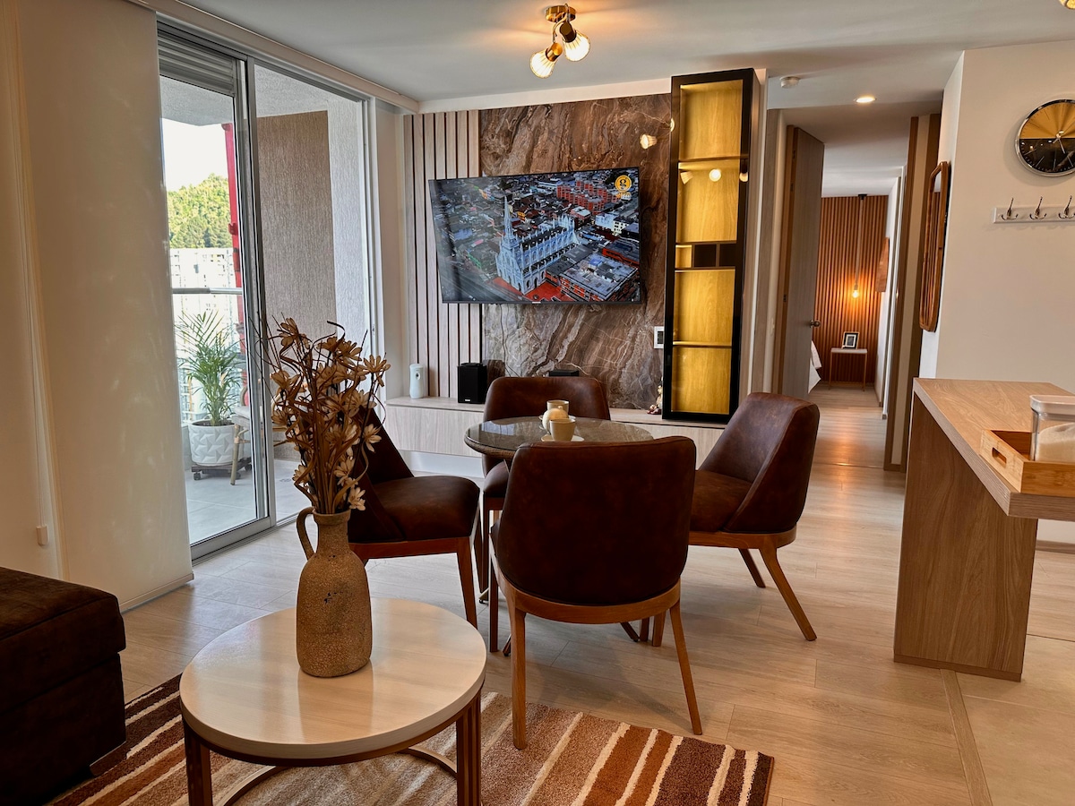 Create unforgettable memories in this accommodation. Modern apartment, very well lit with natural light, located in an exclusive and safe area of Manizales. Excellent view, ideal for families or friends, 3 min walk from Milan's gastronomic area and 5 min from the El Cable sector (Torre del Cable, banks, medical centers, pink and commercial area). Half a block from the main avenue, easy access to public transportation, private parking. Fully equipped with everything you need.