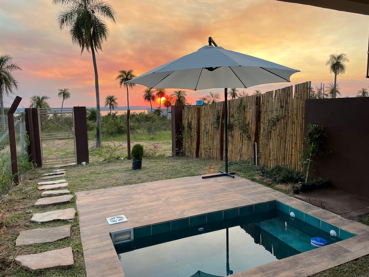 Acogedora suite rodeada de frondosos árboles, pileta y parrilla, ubicada en zona del Anfiteatro a pasos de supermercados, restaurants, bares y lugares turísticos para disfrutar de lo mejor de Sanber! Cuenta con todas las comodidades para descansar, cocinar, trabajar y pasar un buen rato. El lugar nace de la visión de conjugar una vivienda de estilo ecológico con un entorno muy natural, con árboles nativos de gran porte y varias especies de aves que frecuentan el lugar.