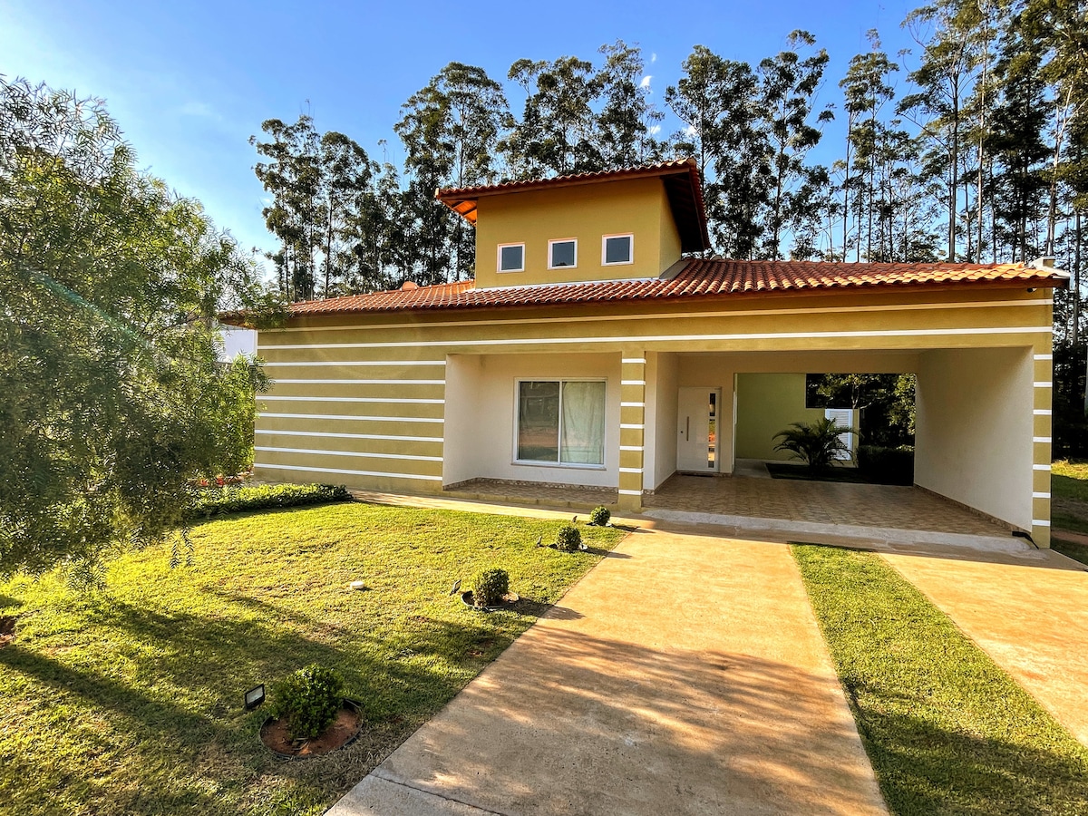 Come and rest! A place less than 3 hours from São Paulo. It has 3 bedrooms, one suite with a bathtub, a total of 2 bathrooms, a living room, a very cozy fireplace room, a dining room with a large table to gather everyone, a barbecue grill, a swimming pool, the outdoor area has a hammock area with 3 hammocks to rest and a pergola with grape vines. The condominium has a trail, lake, club, stand up paddle, kayak, mini golf and restaurant.