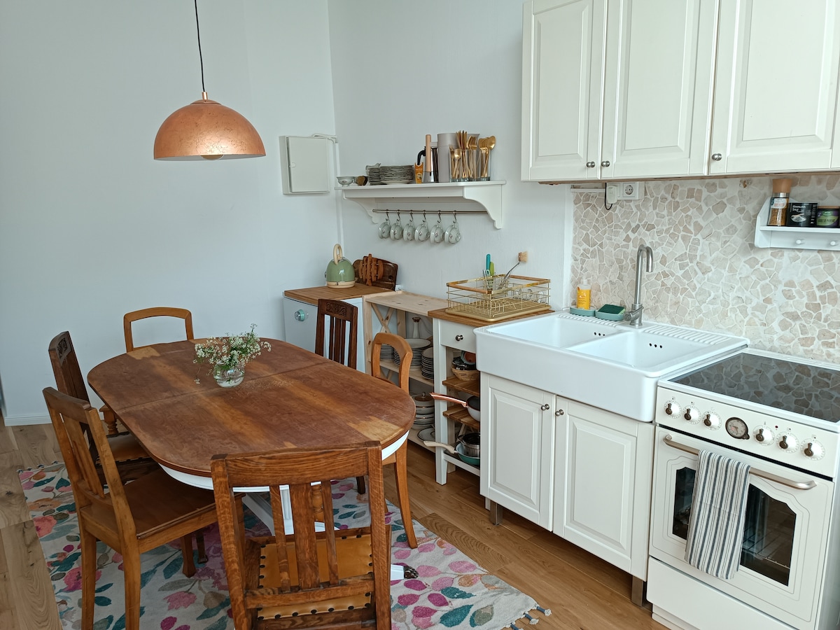 Our apartment is located on a quiet side street in the old village center of Ottersberg. It is 70 m2, has a spacious living room, two bedrooms, kitchen, bathroom and a small garden to relax. The apartment is also fully furnished for longer stays. Interior is comfortably equipped with solid wooden furniture, Italian tiles and oak parquet.