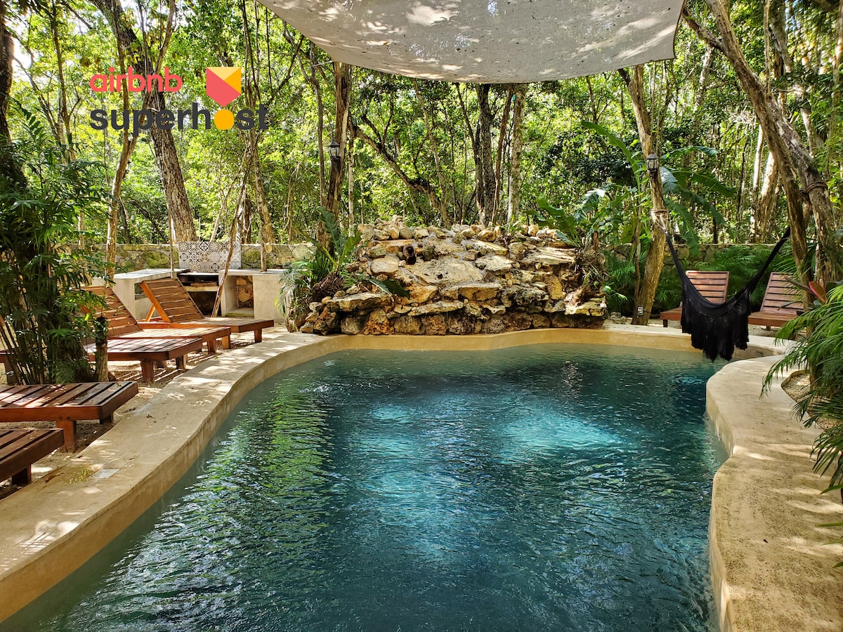 Our home ARKAH, is a one acre jungle oasis with five 2bed/2bath and five 1bed/1bath distancing friendly. ARKAH, is 20 minutes from playa del carmen and 20 min from Tulum and only 5 minutes from the spectacular Akumal Beach. Enjoy the cenote shape pool, BBQ grill, sun beds, free parking, strong A/C, fiber optic WiFi (50 Mb/s), fully equipped kitchen. located on the ground floor with lots of natural light and direct access to the swimming pool.