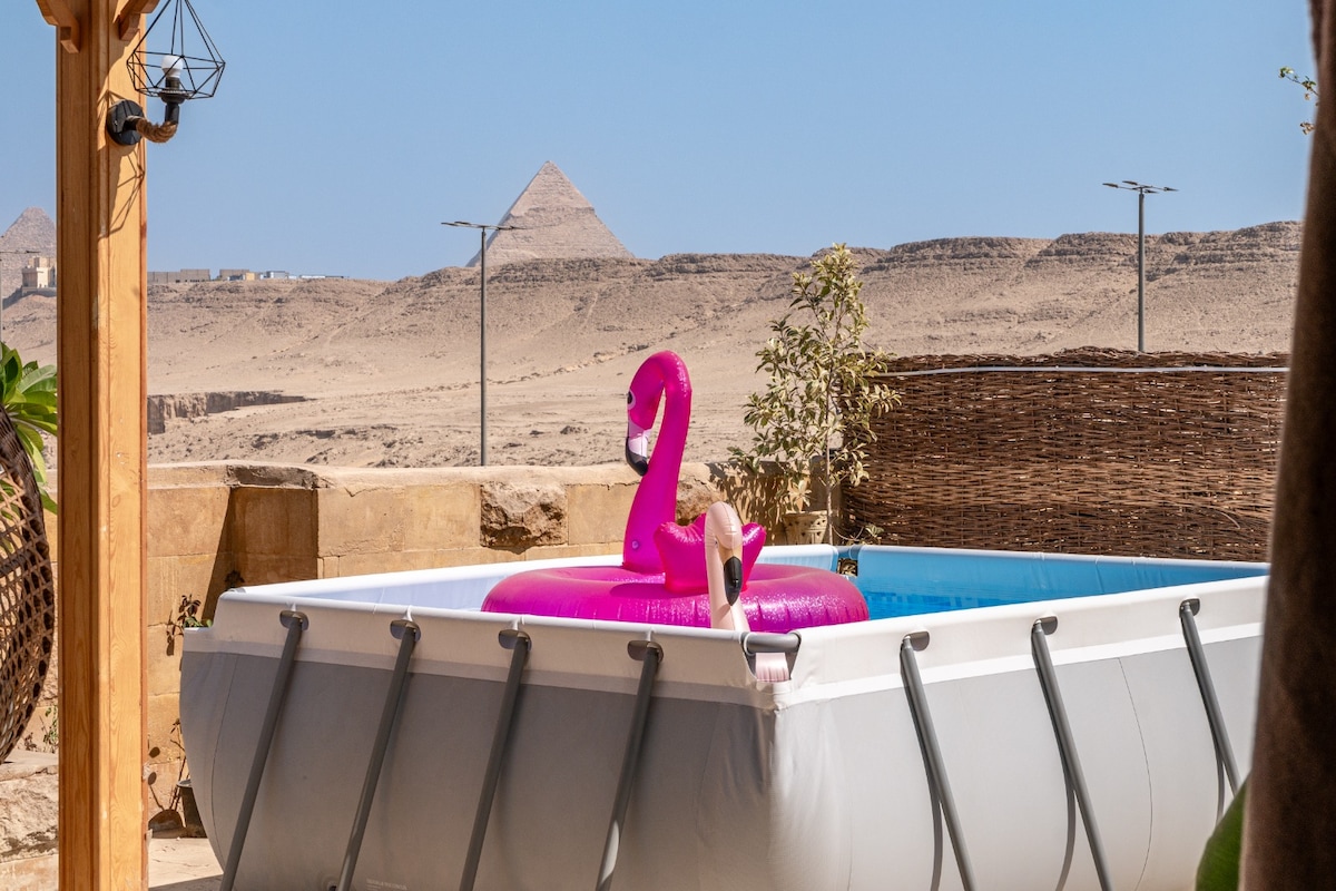 Welcome to a one-of-a-kind retreat just 5 minutes from the Pyramids! This studio offers panoramic Pyramid views and a private hot tub. The space features Pharaonic-inspired design, with unique decor and architectural details that create a historic, cozy ambiance. Enjoy a queen bed, dining area, kitchenette, and private bathroom. Guests also have access to the shared rooftop with stunning views for an unforgettable stay.