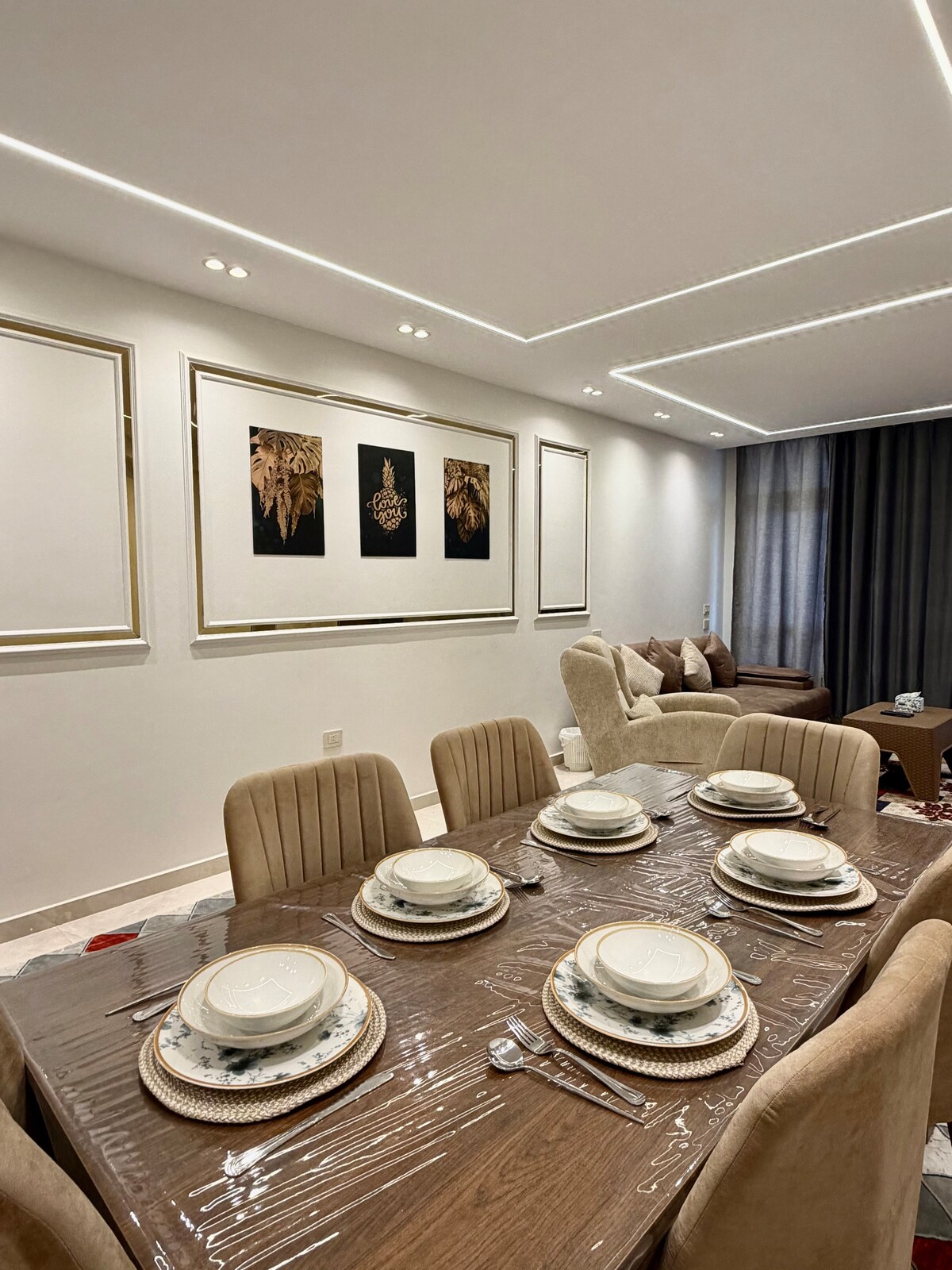 Experience modern boho luxury in this brand-new (Oct 2025) apartment located in the prestigious West Golf Extension, New Cairo — just minutes from 5A Walkway, Cairo Festival Mall, and Katameya’s vibrant spots. Enjoy presidential master bedroom, 4 Smart TVs, concealed A/C, electric shutters, and all-new appliances in a bright, elegant space. Perfect for guests seeking comfort, style, and an upscale Cairo experience.