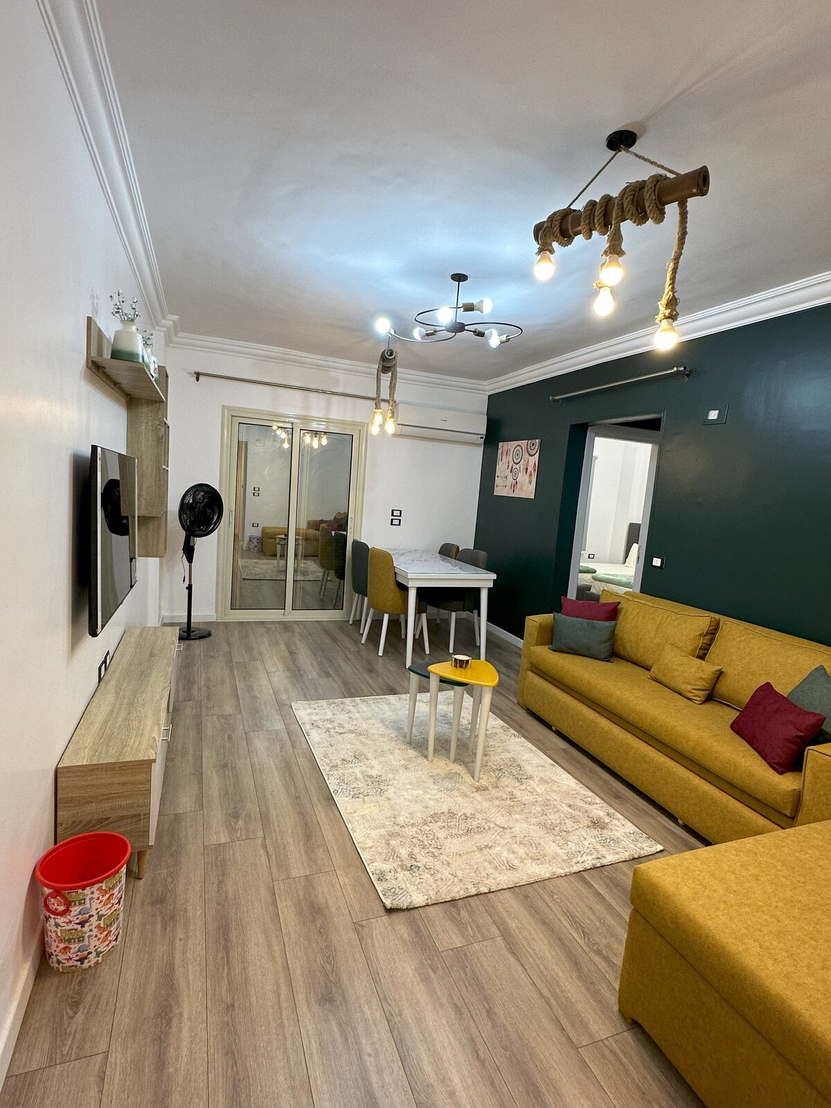 Brand new cozy apartment in El Mansoura – Talkha City. This family well-maintained apartment offers a comfortable living space for families. The apartment features 2 closed bedrooms, one with a king size bed and dressing while the other is with 2 single beds, a modern unique full bathroom, a spacious modern living room with dining table, and a fully equipped kitchen. It is fully equipped with all the amenities needed to make your stay unique and memorable. There is a smart TV, Wifi internet.