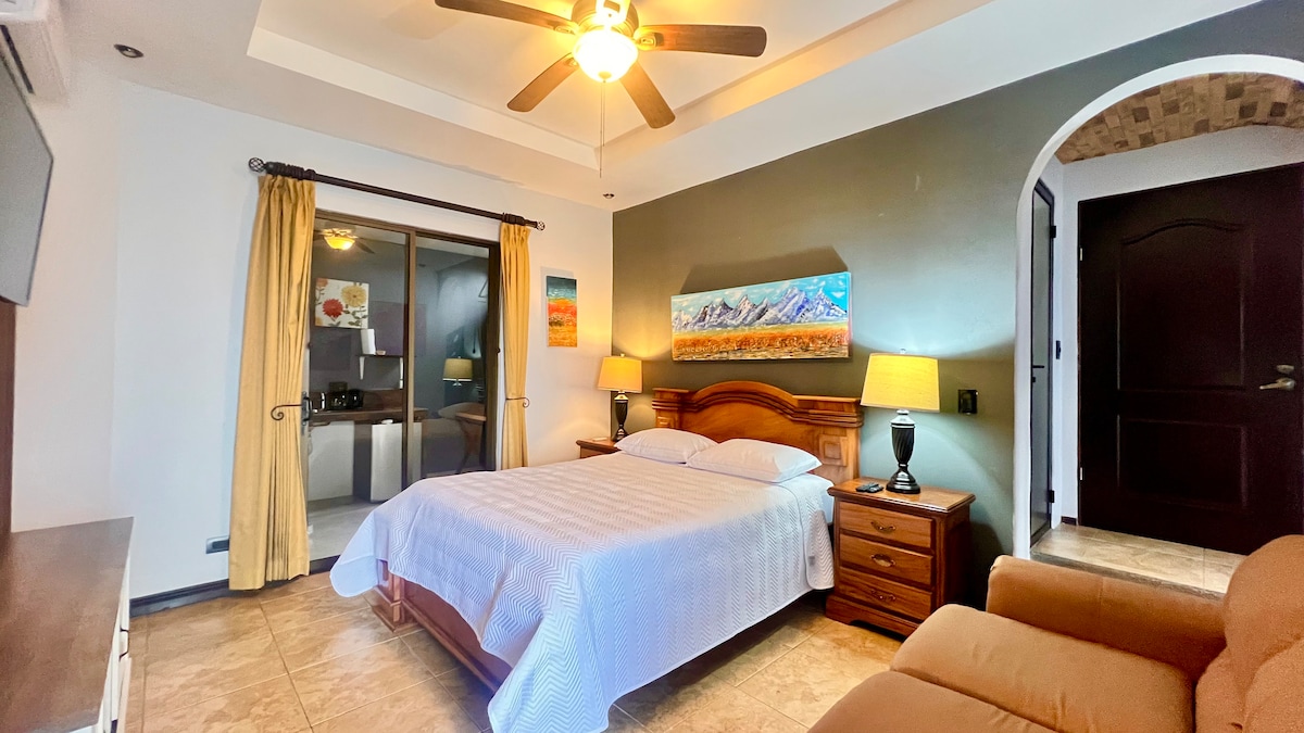 The Pura Vida Suite is a relaxing romantic space with a California king sized bed, air conditioning and an oversized natural stone shower. Enjoy your coffee outside of your double french doors while experiencing nature at its finest. We are known to have approximately 50 varieties of birds on the property. Your room is directly in front of the swimming pool on the main floor