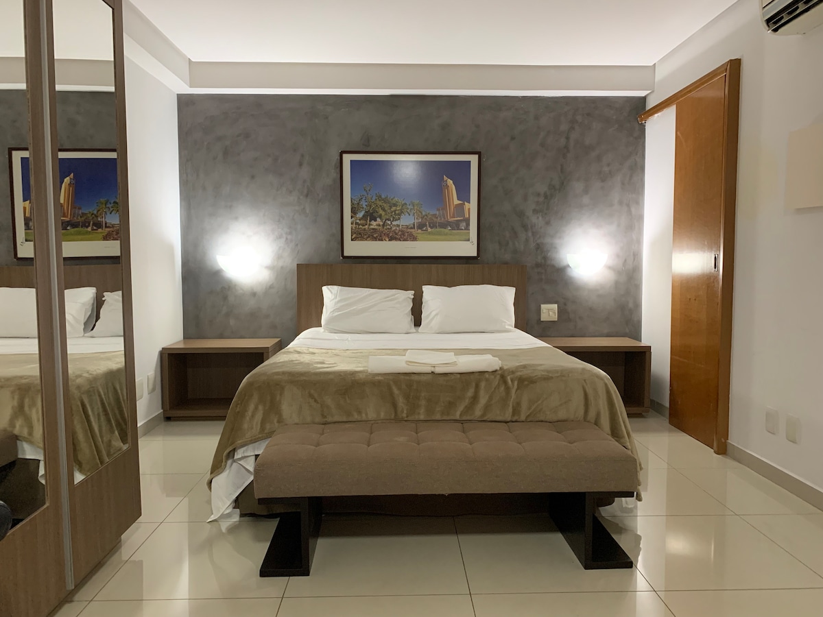 Super comfortable flat, in the best location in Goiânia, near Areião Park. Everything you need for a comfortable stay, such as a kitchen with various utensils, workspace, bedroom with split air-conditioning, Smart TV with Samsung plus and Wi-Fi internet. Close to bars, restaurants, shops in general. 24-hour concierge and parking space. Note: 1 small pet accepted * request more information 🐶 For a third person, request information Serra Dourada 4 km