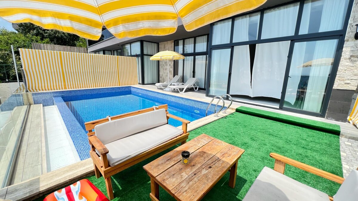 If you stay in this centrally located place, you'll be close to everything as a family. Private pool, indoor garage, sheltered, enclosed, sea and city view, close to the center, 1 bedroom (double bed and sofa in the living room (can be a bed). CLEANING FEE 2,000 TL WATER: 100 TL/Ton ELECTRICITY: 10 Tl/kw Our place is for 2 people max. NO BARBECUE BY THE POOL AND ON THE CARPET.