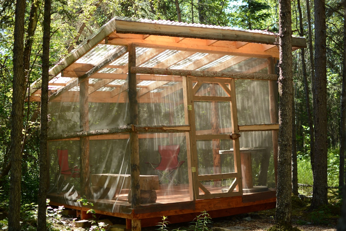 Stay in one of our 3 semi-private campground huts at the edge of Port Alsworth. Located on 40 acres of old growth forest, Tulch'ina Adventures camping huts provide a relaxing experience in nature. Listen to the sounds of the adjacent creek and the birds singing while you relax in one of our bug proof hut shelters. Coming back from the back country? Enjoy a hot shower and a dry shelter to hang your gear before packing up for your international flight.