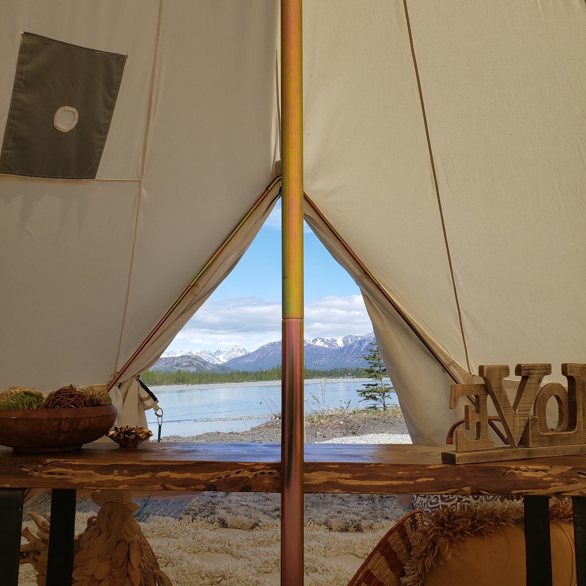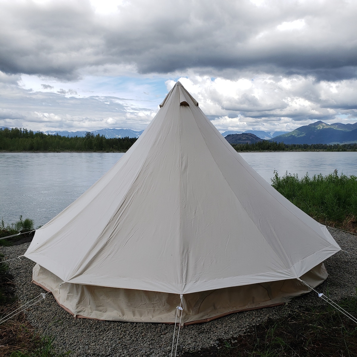 Reconnect with nature at this unforgettable escape. Located on the river's edge of the Knik River in Palmer, Alaska, our glamping tents offer a unique experience. Unplug, unwind and kickback in our canvas style bell tents. Each tent is stylishly outfitted with a queen size bed, linens, rugs, stylish decor and other amenities. Only 45 minutes north of Anchorage, our location boasts incredible views with access to all things outdoor! Also perfect for micro weddings, retreats & small gatherings!