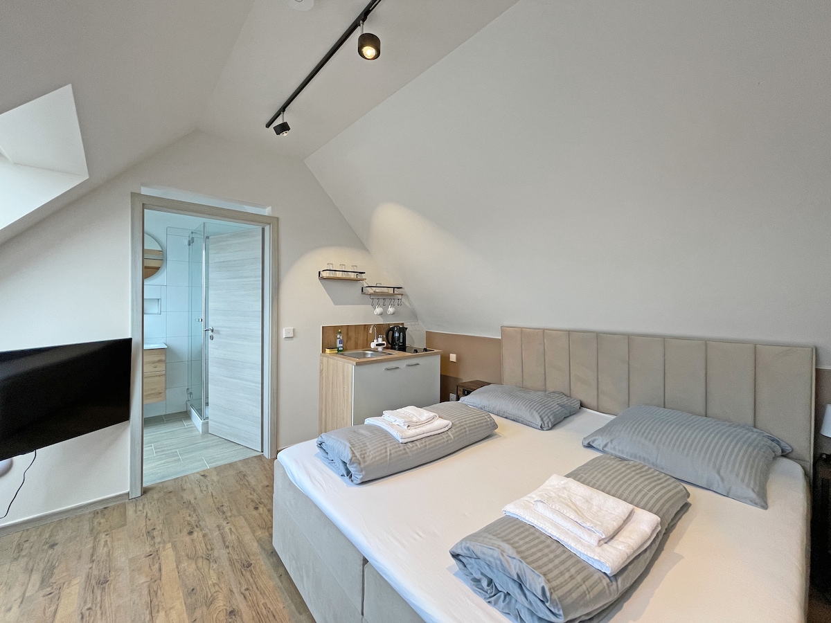 Welcome to our charming attic apartment in Bernstadt! Stylishly decorated in a lovingly restored vacation home, it is the perfect oasis for two people. Spend relaxing days near the Lone Valley, ideal for relaxing walks, or discover Ulm and nearby Legoland. The apartment impresses with its cozy atmosphere, large skylights and a modern bathroom with shower, toilet and sink.