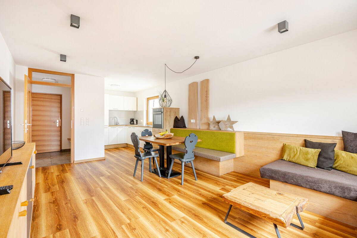 On the Sommersbergerhof in Brixen, 3 various holiday flats, which are furnished in the different time periods of the farm, invite you to a rural holiday. Newly renovated and sustainably built, the flat Sommersbergerhof 2017 enchants its guests with modern charm and a panoramic view of the mountains. The 40 m² flat has a cosy living room, a well-equipped, open-plan kitchen with a dishwasher, one bedroom as well as one bathroom and can therefore accommodate 4 people.