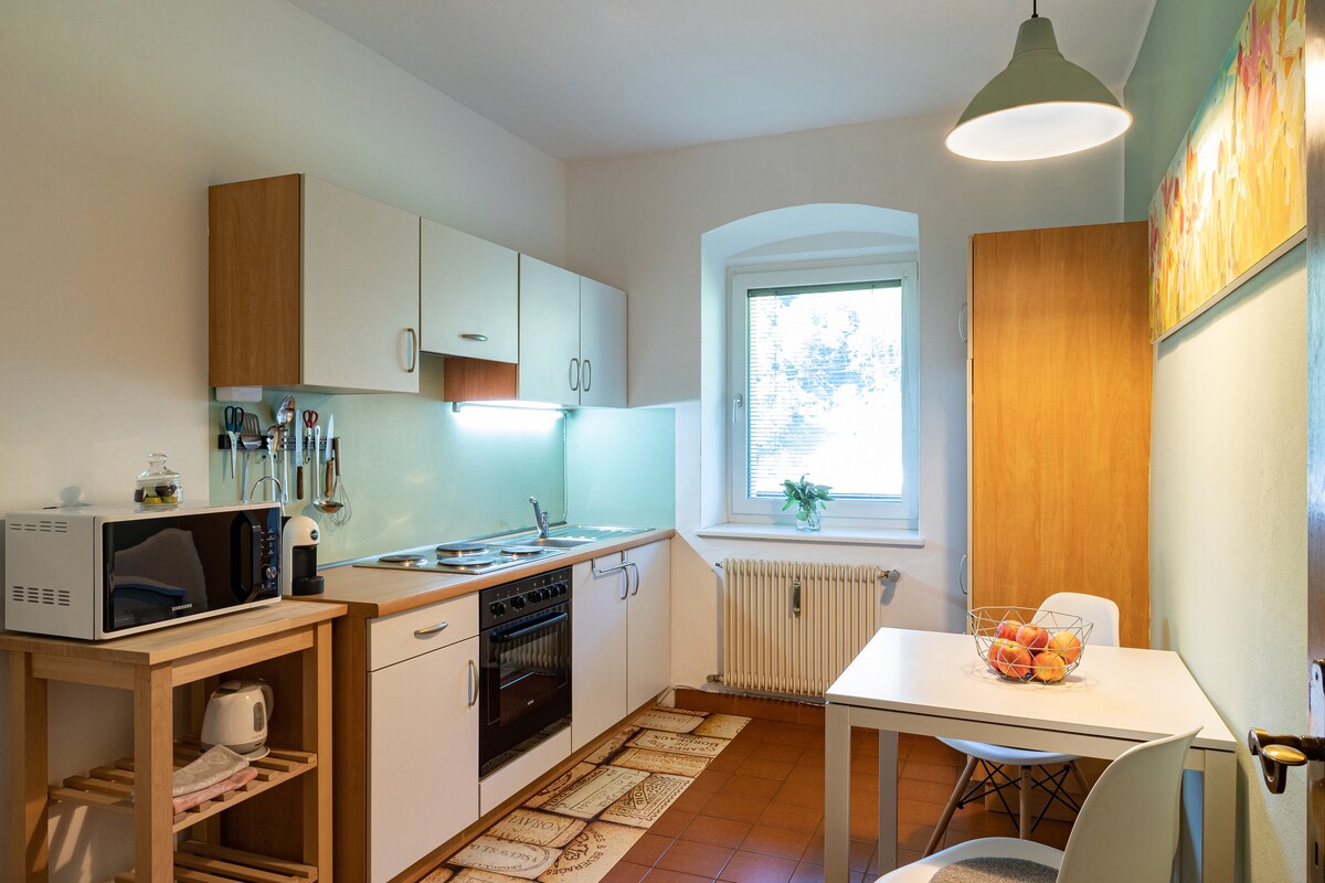 Das Apartment liegt im Erdgeschoss unseres Einfamilienhauses. Die 60 m² große Wohnung liegt fußläufig 2 min vom Stadtzentrum des Künstlerstädtchens Klausen entfernt sowie direkt am Radweg. Mit den sehr nahe gelegenen öffentlichen Verkehrsmitteln können Sie schnell beliebte Städte wie Bozen oder Brixen erreichen, einen Ausflug auf eine der nahegelegenen Almen wie die Villanderer oder Seiser Alm sowie auch nach Gröden oder Villnöss machen. Parkplatz für Auto und Motorrad auf dem Gründstück.