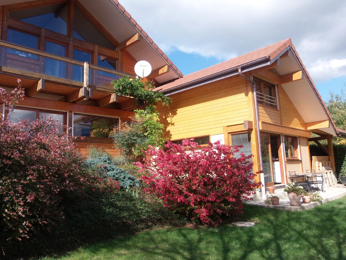 Our independent chalet, not overlooked, between lakes and mountains is ideal for couples who love nature and want to relax in peace. The chalet is not suitable for children and infants. At an altitude of 650 m, the 180° view from the terrace is exceptional over the surrounding mountains. Pets not allowed. Birds of prey and other birds as well as large animals (deer, hinds) can be frequently observed depending on the season.