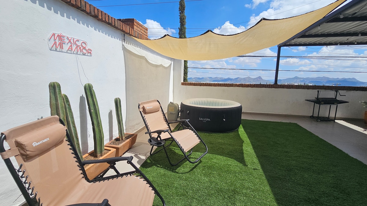 Welcome to a space designed for relaxation. Our house combines a private outdoor Jacuzzi, an ideal location that connects you to the entire city, and a comfortable TV area, creating a perfect atmosphere for resting or working. Minutes from Chihuahua's most important points, with access to restaurants, shops, and avenues When you return, you can enjoy the Jacuzzi, cook, or just watch a movie in a comfortable space. Ideal for couples, business trips and family.