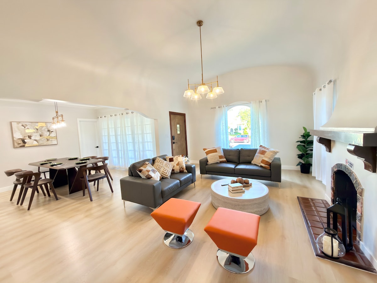 This restored modern Spanish home is centrally located near DTLA! The perfect place for you and your family to call home while in So Cal. Enjoy luxurious amenities like king size beds, salt water jacuzzi/spa, firepit lounging, back yard bbq, games, a fully equipped kitchen and much more. 8 miles from Dodger Stadium 10 miles from Crypto Arena 14 miles from Universal Studios Hollywood 23 miles from Knott's Berry Farm 25 miles from Sofi Stadium 26 miles from Disneyland 27 miles from LAX Airport