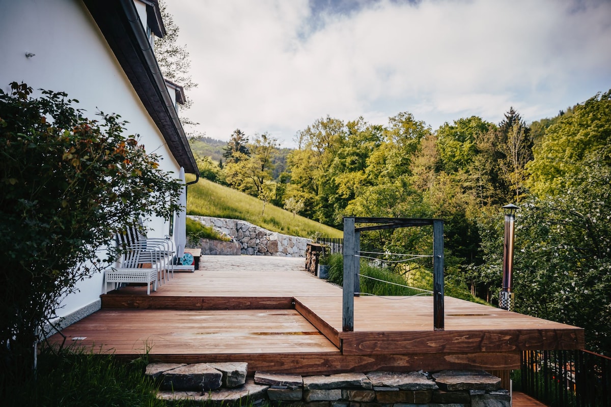 Perfect for a relaxing holiday for couples or families! Large garden with a small house, BBQ terrace, outdoor kitchen, and outdoor shower – perfect for enjoying the open air. Public pool, hiking trails, cycling routes, and other activities nearby. The sunny apartment, renovated in 2025, offers 72 m² of comfort for 2–4 guests and is fully equipped. A fifth bed can be added if needed. Washing machine in the basement is available for shared use. Not available for contractor groups.