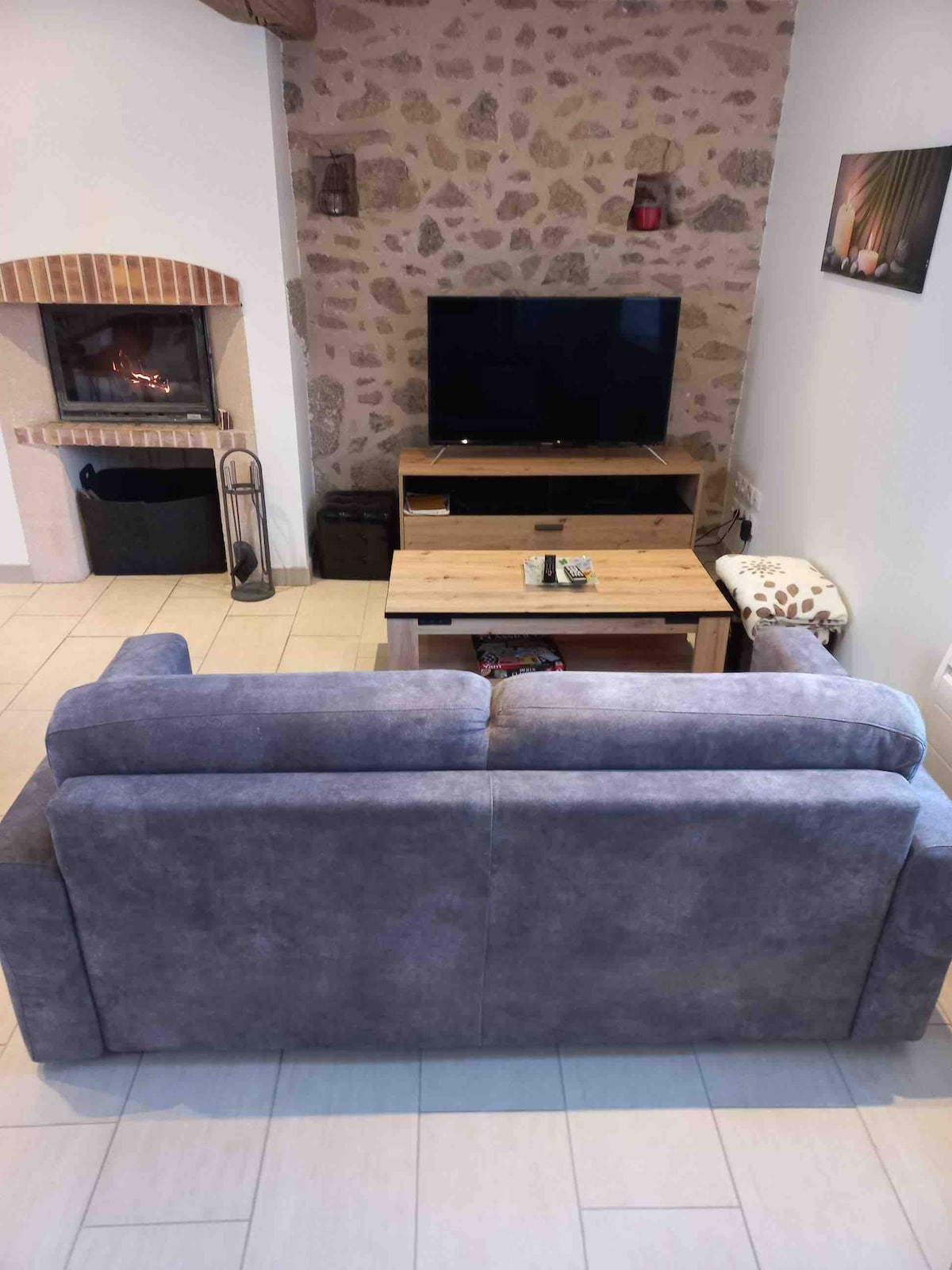Cool, comfortable and spacious (90m2) home on 2 floors. Large kitchen , lounge and terrace on street level and fabulous 1 double bedroom open plan room on the 2nd floor. A converted grange perched on a mountain in a medieval village 16 minutes from the A6, this peaceful home makes an ideal stop over for holidays in the Alps or south of France. Please note - there is a studio apartment with its own entrance on the lower ground floor - rented separately.