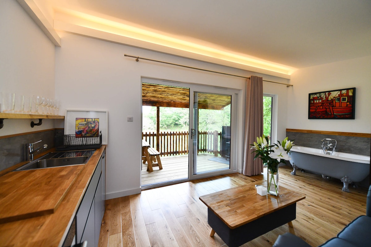 Kyle Lodge is our new one bed lodge set in the private grounds of our larger property, The Old Church (which sleeps 12). It is a private and exceptionally comfortable space featuring a roll top bath with views of open countryside. The secluded and sheltered covered decking area with woodburner allows you to enjoy nature all year round. The local grocery shop is a 5 minute walk, with many restaurants and outdoor attractions only a short drive.