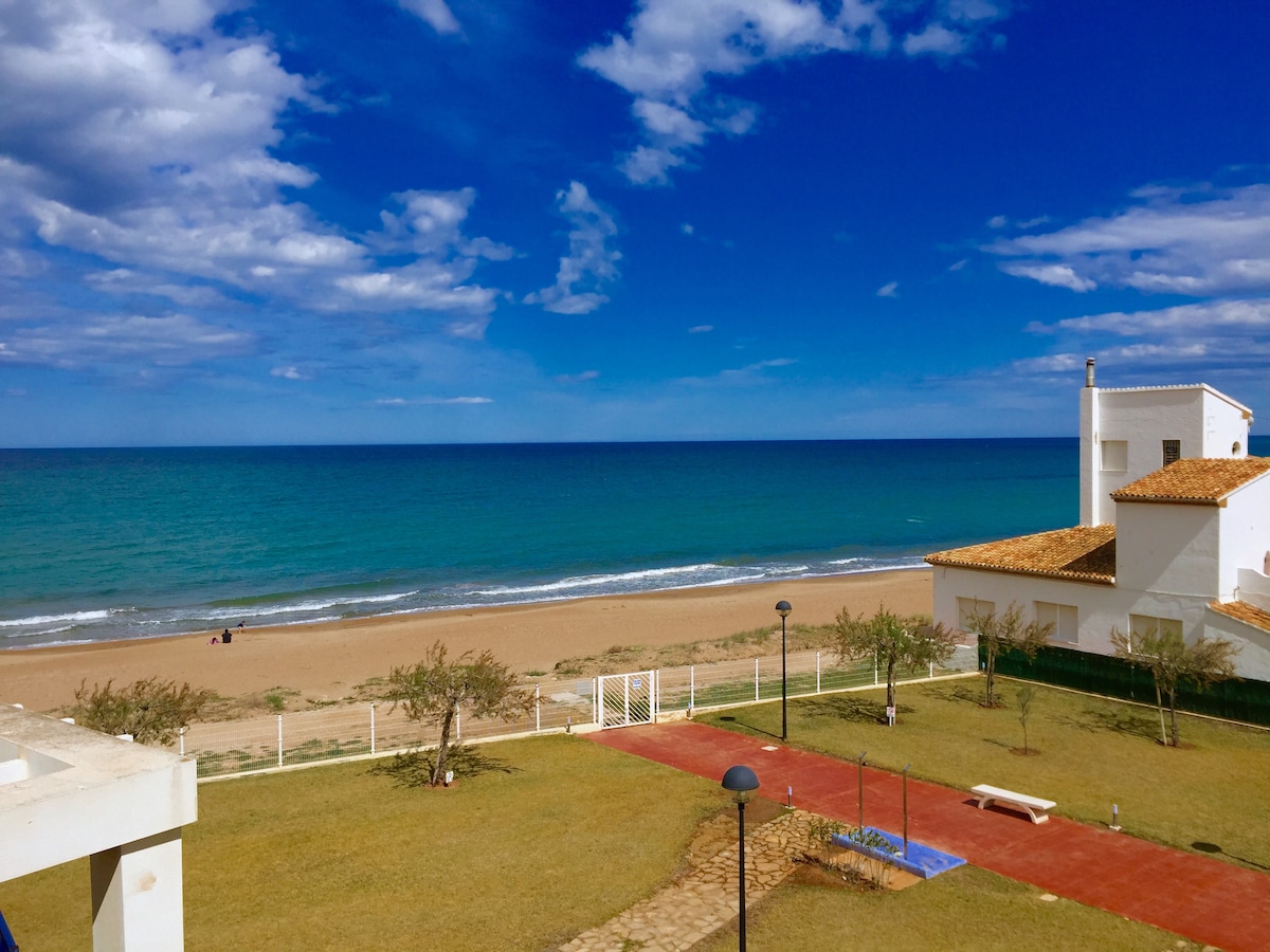 Wake up with the sea at your feet! Luxury duplex on the first line, literally on the sand, with frontal sea views from every room and a spacious terrace. Ideal for 4 guests, it has 2 double bedrooms, 2 bathrooms, fully equipped kitchen, laundry room with washing machine, and air conditioning throughout. Located in a recently built complex with direct beach access, large swimming pool, and paddle court. ✔ First line ✔ Sea views ✔ Pool ✔ Direct beach access