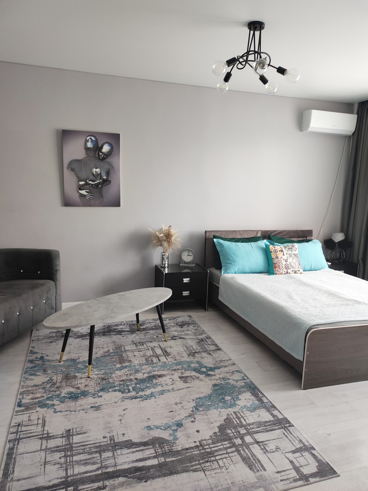 Dopamine apartment in the city center! A great place for a comfortable stay: • A spacious and bright living room with high ceilings. • Equipped kitchen for those who like to cook. • A cozy bedroom with a great city view. • Within a walking distance there are shops, cafes and restaurants, parks, pedestrian streets. We created this space to make you feel at home, and the city rhythm is always nearby.