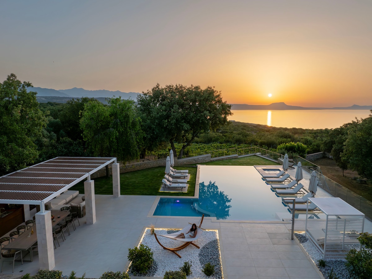 This stunning contemporary architectural gem is perched on the northwest coast of Crete near the town of Chania. With panoramic views of the Aegean Sea, the multi-level home offers high-end luxury style and comforts while honoring the timeless natural beauty and coastal culture of the Greek Islands. Expansive outdoor living areas, spacious interiors, superb wellness amenities, and five bedroom suites form ideal retreat for reunions with loved-ones and friends. Savor exquisite hours by the villa's infinite swimming pool, sunbathing on comfortable loungers, plunging into the crystalline water, and gazing on the vast expanse of sea and sky. Enjoy refreshments from the bar in the afternoon as the kids play in the garden and gather for an alfresco meal of local seafood and delicacies. The extraordinary outdoor kitchen is a cook's dream, with ample prep areas and a rustic barbeque spit roast for classic gyros. In the evening, admire the sunset from the veranda and gather in the enchanting cave with a bottle of fine Greek wine. The villa's interior is ideally designed to imbibe the natural sunlight and sea-fresh breeze. Enjoy downtime in the salon on its low-slung sectional, or join each other in the living room with high ceilings and beautiful piano. The kitchen is fully equipped with chef-grade appliances, while the sea-view dining room features a glass wall that opens to the terrace. The upper floor features two bedrooms: a master suite with king bed, living area, walk-in closet, and beautiful Aegean views, and a guestroom with two single-size beds. The ground floor features one suite with a queen bed, sofa bed, lounge, and doors to the pool; while the lower level includes two queen bedrooms. Both of the lower-level rooms open to a furnished terrace and enjoy views of the sea. Terra Creta is within five to seven kilometers of three of the island's most enchanting beaches—Kalathas, Koum Kapi, and Nea Chora—and six kilometers of the town of Chania, where you'll discover a unique blend of Venetian, Egyptian, and Ottoman architecture reflecting Crete's rich maritime history. With Chania International Airport less then ten kilometers away, Terra Creta is an excellent choice for destination wedding guests. Copyright © Luxury Retreats. All rights reserved. BEDROOM & BATHROOM First Floor • Bedroom 1: King size bed, Ensuite bathroom with stand-alone shower, Walk-in Closet, Lounge area, Television, Balcony, Safe, Desk, Sea views • Bedroom 2: 2 Single size beds, Ensuite bathroom with shower/bathtub combo, Television Ground Floor • Bedroom 3: Queen size bed, Sofa bed, Ensuite bathroom with stand-alone shower, Lounge area, Television, Sound system, Safe, Access to pool area Lower Floor • Bedroom 4: Queen size bed, Ensuite bathroom with stand-alone shower, Television, Terrace, Sea views • Bedroom 5: Queen size bed, Ensuite bathroom with stand-alone shower, Television, Terrace, Sea views FEATURES & AMENITIES • Cave • More under “What this place offers” below Included: • Pool maintenance • Garden maintenance • More under “What this place offers” below Extra cost (advance notice may be required): • Pool heating • Activities and excursions • More under “Add-on services” below