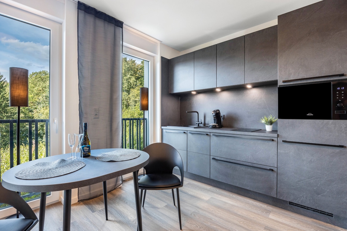 Take the whole family to this great place with plenty of space. Our spacious apartment offers plenty of space not only for families but also for wheelchair needs. The Eiche apartment has a large living room with a sofa bed for 2 people. There is a nice dining area with direct access to the ground-level terrace. There is a separate fully equipped kitchen, a guest toilet and a full bathroom. The bedroom features a double bed. The apartment is 95 sqm.