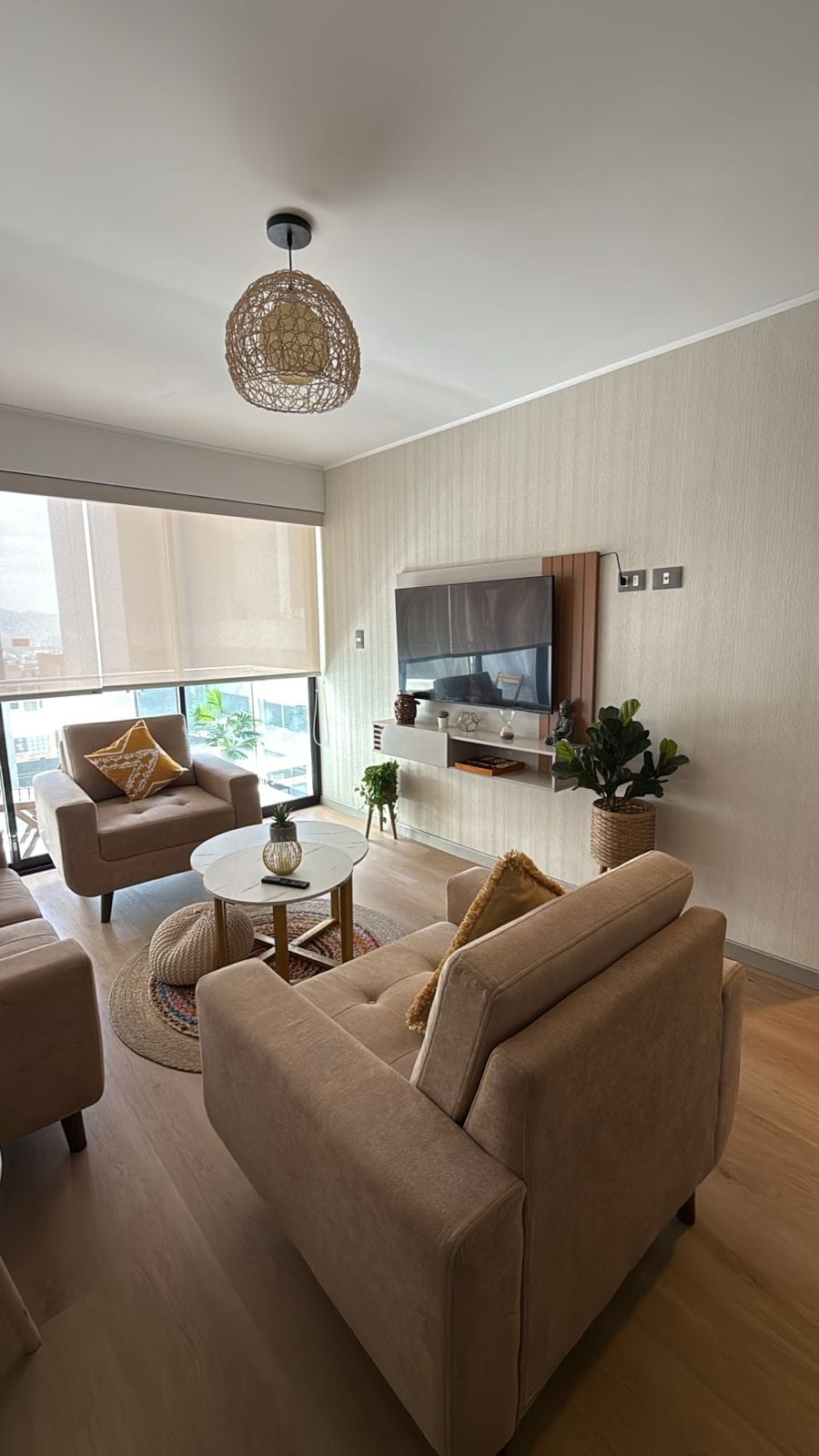Enjoy a safe, comfortable and stylish experience, close to downtown Arequipa. Modern apartment with independent entrance and digital lock. ✨ What it offers: 1 bedroom with queen-size bed, illuminated walk-in closet, work area. Fully equipped kitchen: refrigerator, oven, coffee maker, blender, full set of dishes. Bathroom with hot water, hair dryer and iron. Large room with 65” Samsung TV + Netflix, Disney+, Prime Video. Patio with a washer and dryer area.