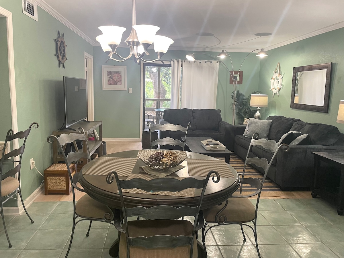 Beachy vibes, 1 block from the Beach. Relax and unwind in this comfy beautifully designed space. Newly renovated kitchen & well stocked (pots, pans, coffee maker, toaster, etc.) ready for use. Condo includes everything you need for a day of fun at the beach (beach chairs, umbrella's, boogie boards, beach towels and beach toys) or just enjoy the amenities(in ground pool, tennis and pickleball courts, playground, and BBQ area). Includes tennis racquets & more. Tropical wooded view, pet friendly