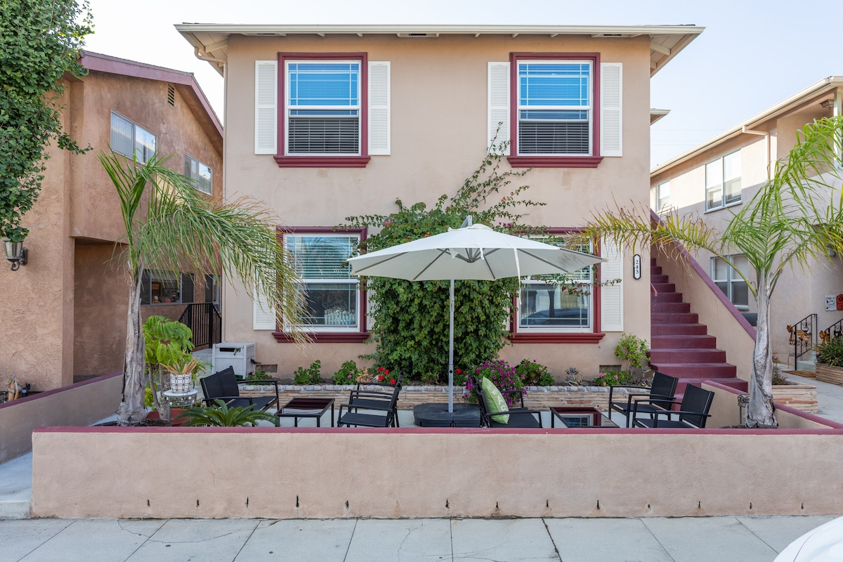 Spacious upper apartment, 2nd floor) Featuring a totally private large rooftop deck with custom gas fire pit, ping pong,lounge chairs.All new comfy bedding and mattresses along with a new large sectional that sleeps 2, comfortable as a 3 rd private bedroom. Ideal location in Belmont Shore. On a quiet residential street but only 2 min walk to 2nd street, restaurants and 8 min. walk to the beaches. Dine al freco on large private deck.