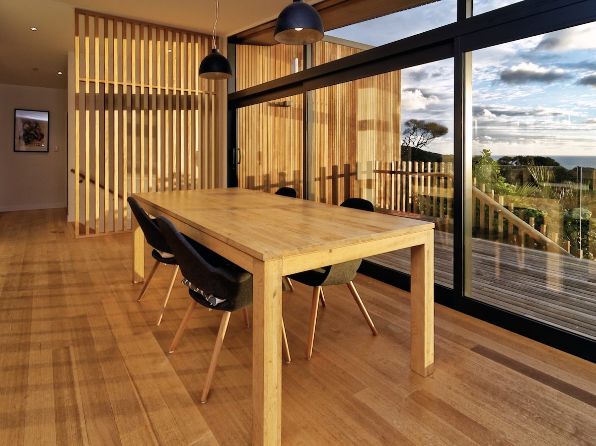 Designed to capture the sun and the sweeping ocean view. Wood-burner for cosy winter nights and unlimited fibre broadband wifi for Netflix. Pull back the ranch sliders in summer and open the house to the outdoors. Relax with dinner, drinks and the setting sun on the covered outdoor deck. Underfloor heating the bathrooms provides all year comfort. It's a 5min walk down the road to the start of the beach track and then a 20min stroll through the bush down to the beach (or a 3min drive!)