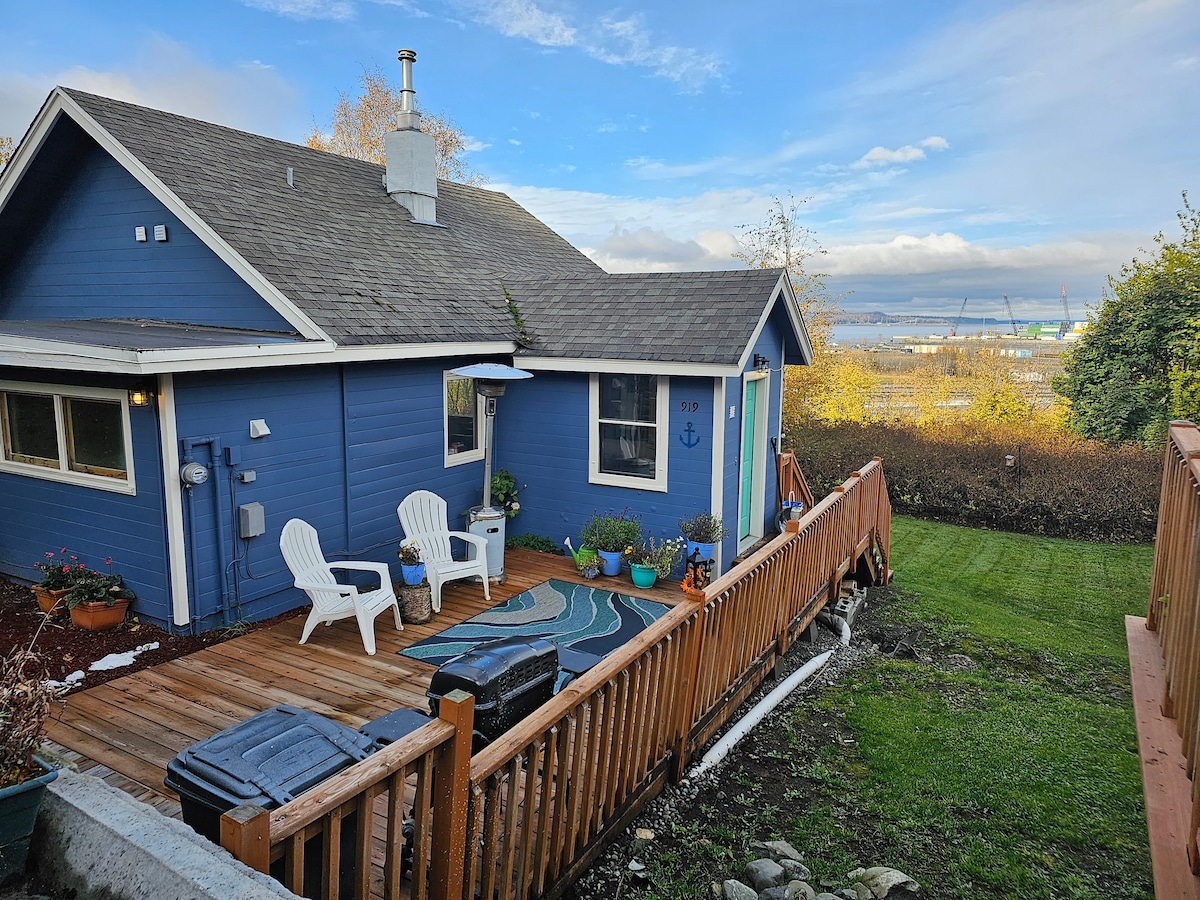 This newly renovated cottage is in a downtown setting yet out of the bustle of busy city streets. It has a great view of the inlet and port, ands sits above the railyard. The bedroom has a KING size cool foam mattress and full bathroom with shower. On chilly nights enjoy an electric fireplace while cooking in the fully equipped kitchen. The large backyard has a deck with table and chairs, as well as a firepit. There is a desk to work at and high-speed wifi internet, plus a free parking space.