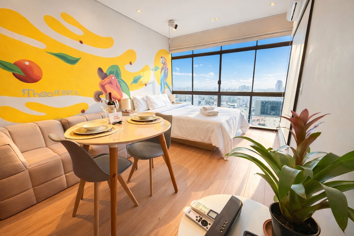 Charming studio on the 26th floor of the iconic Edifício Copan, with stunning city views. The apartment combines modern design, Brazilian art on the walls, and plenty of natural light. Comfortable bed, air conditioning, dining table, and a large screen with a projector for enjoying movies in style. Cozy and well-equipped space in the heart of downtown São Paulo, ideal for those looking for the unique experience of staying in one of the city's most famous buildings.