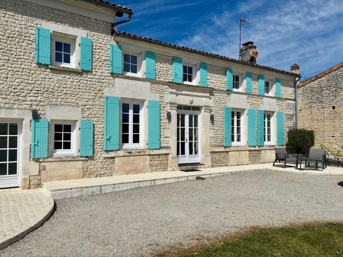 Cosy renovated farmhouse in the heart of the Cognac region, with shared pool and wheelchair access. Situated in Grande Champagne, the house is ideal for families and offers a country-style living environment. Spacious living room with wood-burning stove (wood available). 4 en suite bedrooms (one with wheelchair access). Private wooded garden. Cool in summer! Access to a large swimming pool. High-speed internet connection. 5 bicycles available on site (4 adults and 1 child).