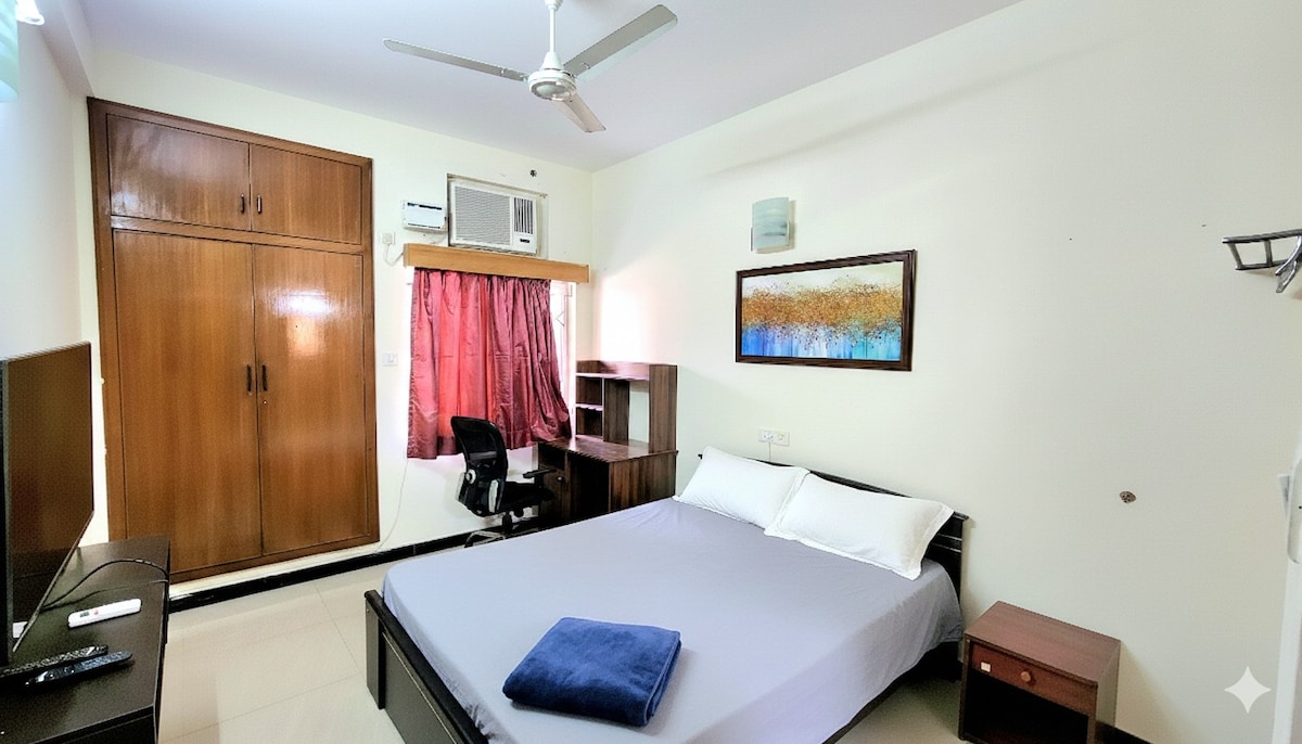 Welcome to your peaceful getaway in the heart of Chennai’s vibrant IT corridor! and business zone. Our 1-bedroom suite is nestled in a calm residential community in Perungudi, OMR. Guests enjoy access to amenities like a swimming pool, gym, and more. Our fully equipped suite is perfect for leisure, business travelers, digital nomads, couples, or families, offers the ideal blend of comfort, convenience, tranquility and a peaceful retreat with the city's best conveniences right around the corner.
