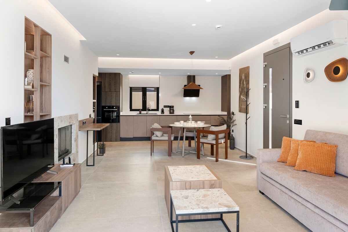 Escape to suite Elaia, a luxury sanctuary in Ano Kalesia, part of the Kalles Homes & Suites project, just 15 mins from Heraklion. This contemporary suite comfortably fits 4 guests and features a stunning private overflow pool, a large garden, and BBQ. Experience the authentic Cretan charm with modern elegance, perfect for couples, couples families or friends seeking tranquility and style. Enjoy the spacious living areas, the fully equipped kitchen, and the privacy of your own oasis.