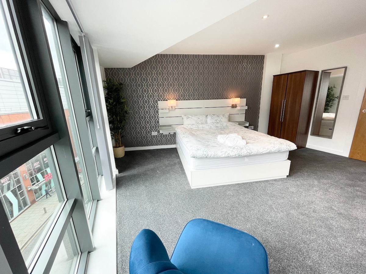 Stylish city center apartment, thoughtfully furnished. Boasting a serene balcony and nestled within the tranquil green quarter. Relax in a spacious king-size bed paired with an exceptional Emma Original Hybrid mattress. Stay connected with fast 5G home broadband. Ideally situated in close proximity to the AO arena and Victoria Station for easy access to football stadiums and beyond.