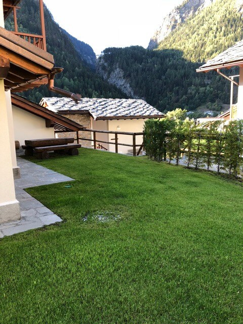 Newly built Villaggio delle Alpi. Three-room apartment with a large garden and a covered parking space. Common room with billiards, soccer and TV with Sky. Sleeps four, indoor and outdoor table. Barbecue. Two televisions, one with Netflix, washing machine, dryer, microwave, and dishwasher. All new and very clean. The Residence provides, for a fee, sheets, towels. Final cleaning included. 300 meters from the Terme di Prè-Saint-Didier, 5 minutes from the Courmayeur slopes, and 15 minutes from La Thuile.