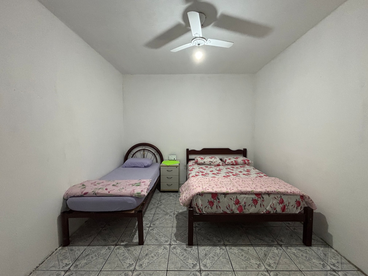 Relax with the whole family in this quiet accommodation. Located 800 meters from the Sanctuary of Aparecida, you can walk there in 15 minutes. We have 2 bedrooms that accommodate 6 people, 1 bathroom, a kitchen equipped with household utensils, a living room with a TV with more than 100 channels available. The garage measures 4m and accommodates a small and medium-sized car, and a gourmet area with a barbecue grill, table and chairs.