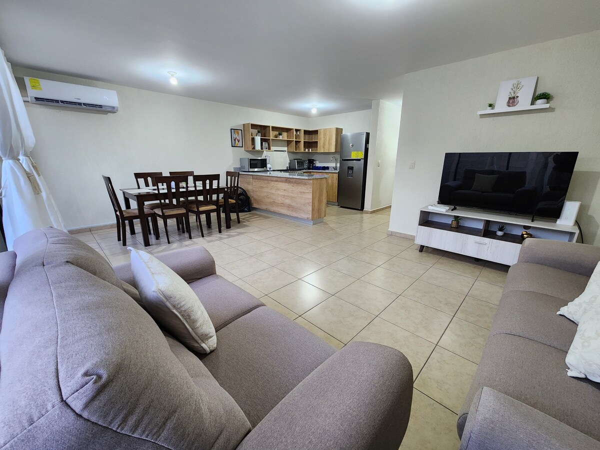 Enjoy a quiet, comfortable, cozy, safe space with 24/7 surveillance, and everything you need to make your experience pleasant, in one of the most exclusive residential areas in the metropolitan area. Space for 5 or 6 people, 3 parking spaces available, air conditioning in the living room and 2 bedrooms, fully equipped kitchen. It also has access to a swimming pool, sports courts and a residential park, ideal for your visit to the country during these New Year's Eve and Christmas holidays.