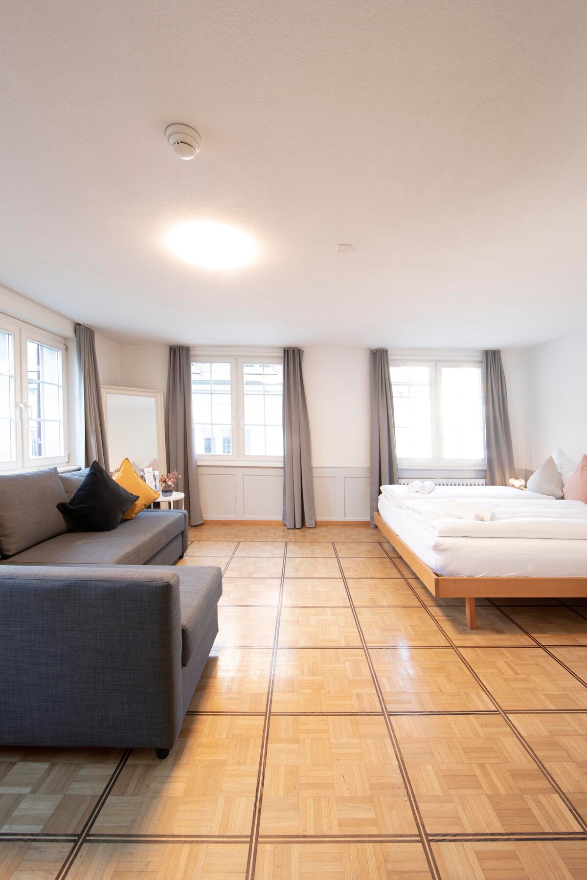 Bright 70 m² 3½-room apartment in Herisau with beautiful rooftop views. Perfect for families or groups, it features two bedrooms with a double bed (180x200 cm) and two singles (80x200 cm), plus a sofa bed (165x195 cm). Enjoy an open-plan living area, fully equipped kitchen with tea/coffee maker, modern bathroom with shower, separate sitting area, and work desk. Wheelchair accessible for added convenience.